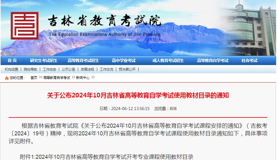 根据吉林省教育考试院《关于公布2024年10月吉林省高等教育自学考试课程安排的通知》(吉教考〔2024〕19号)精神,现将2024年10月吉林省高等教育自学考试课程使用教材目录通知如下,具体事项详见附件。