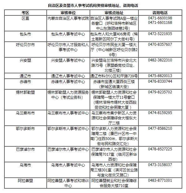 自治区及各盟市人事考试机构资格审核地址、咨询电话