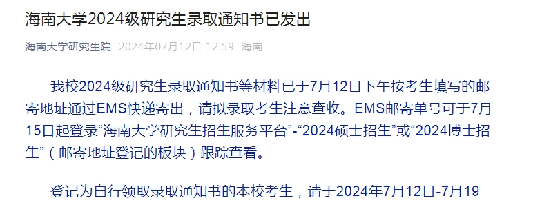 我校2024级研究生录取通知书等材料已于7月12日下午按考生填写的邮寄地址通过EMS快递寄出,请拟录取考生注意查收。EMS邮寄单号可于7月15日起登录海南大学研究生招生服务平台2024硕士招生或2024博士招生(邮寄地址登记的板块)跟踪查看。