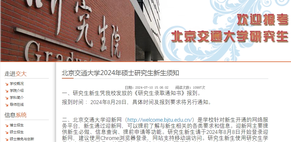 二、北京交通大学迎新网(http://welcome.bjtu.edu.cn/)是学校针对新生开通的网络服务平台,新生通过迎新网,可以提前了解与新生相关的各类要求和信息。迎新网主要提供新生必做、信息查询、提前申请等功能。研究生新生请于2024年8月8日开始登录迎新网,建议使用Chrome浏览器登录,网站支持移动端访问。研究生新生使用研究生学号和身份证号登录,按要求完成新生必做预报到手续。新生必做环节主要包括:个人信息采集、《学生手册》答题、新生问卷调查、新生必读、户口迁移、入学安全教育、校医院一封信、心理健康与安全教育知识手册学习、科学道德与学风建设答题和新生入学教育学习答题等内容。新生必做是新生报到的必须步骤,请按时完成。