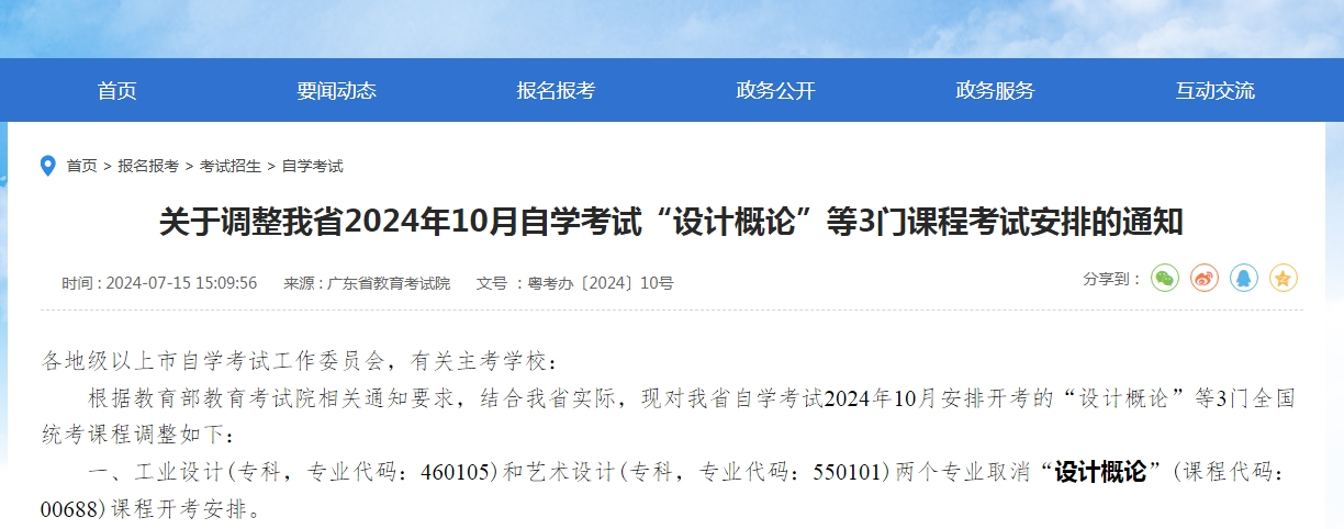 根据教育部教育考试院相关通知要求,结合我省实际,现对我省自学考试2024年10月安排开考的设计概论等3门全国统考课程调整如下: