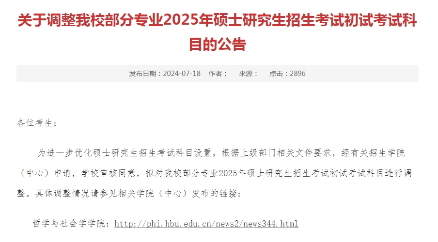 为进一步优化硕士研究生招生考试科目设置,根据上级部门相关文件要求,经有关招生学院(中心)申请,学校审核同意,拟对我校部分专业2025年硕士研究生招生考试初试考试科目进行调整。具体调整情况请参见相关学院(中心)发布的链接: