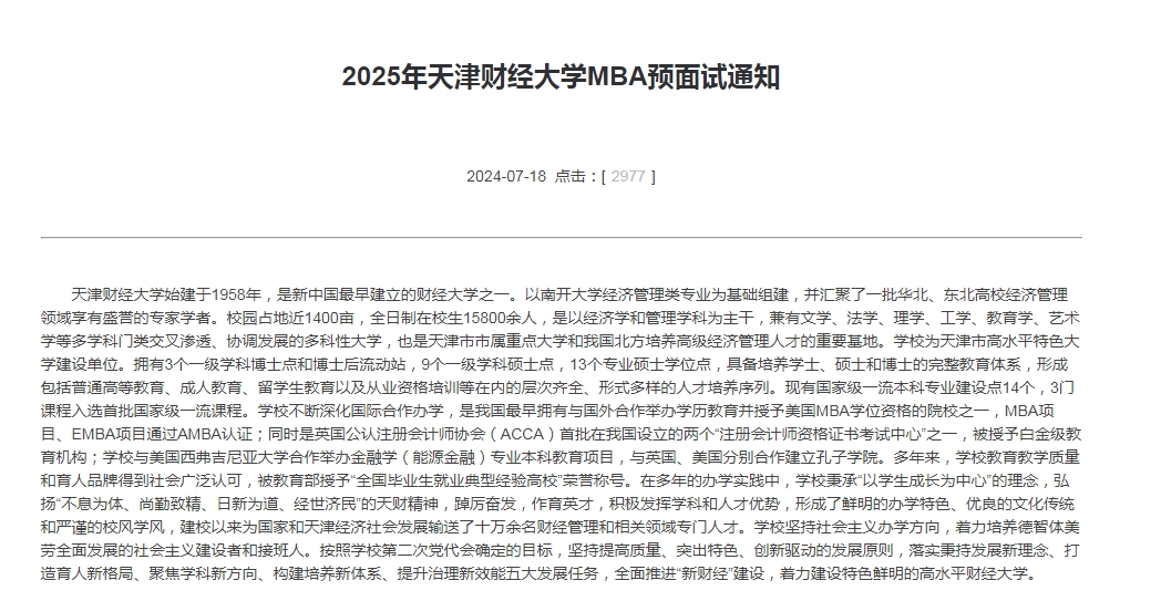 说明:本通知解释权属于天津财经大学MBA教育中心,2025年MBA复试工作以及录取规则将严格按照教育部关于2025年全国硕士研究生复试及录取工作的相关文件执行。