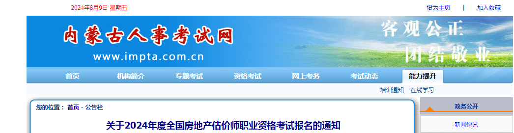 2024年度全国房地产估计师职业资格考试实行统一网上报名。我区网上报名时间为2024年8月15日9:00—8月29日24:00;网上缴费截止时间为2024年8月31日24:00。 报考人员可直接登录内蒙古人事考试网(www.impta.com.cn) 进行报名。