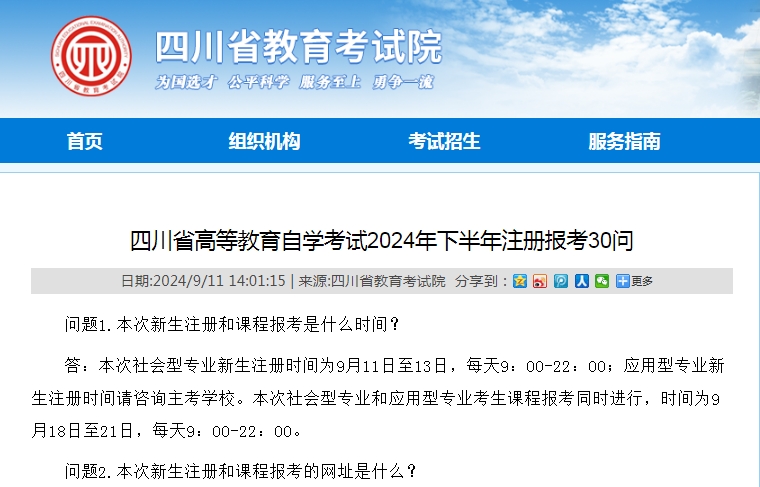 四川教育考试院近日发布了《四川省高等教育自学考试2024年下半年注册报考30问》。根据公告,2024年10月自学考试社会型专业新生的注册时间为9月11日至13日,每天的注册时间为9:00至22:00。考生需在此期间登录指定的报名平台进行注册,填写个人信息并上传相关材料。