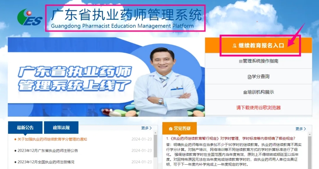 使用【电脑】打开浏览器(建议使用谷歌浏览器打开网站),搜索【广东省执业药师管理系统】(https://zyys.gdfda.cn),点击【继续教育报名入口】登录。