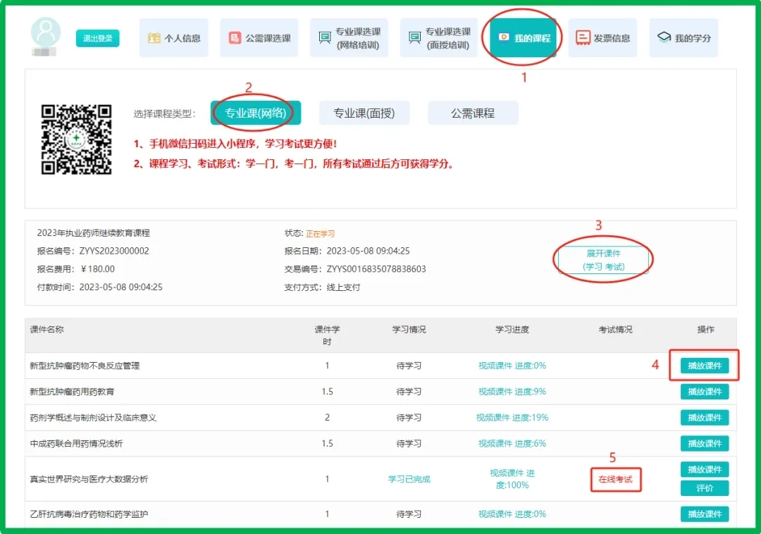 点击【我的课程】,然后选择【专业课(网络)】和【展开课件】,进行学习和考试(视频课件支持1.5倍观看),全部课程考试通过之后,授予2024年度执业药师继续教育专业课学分。