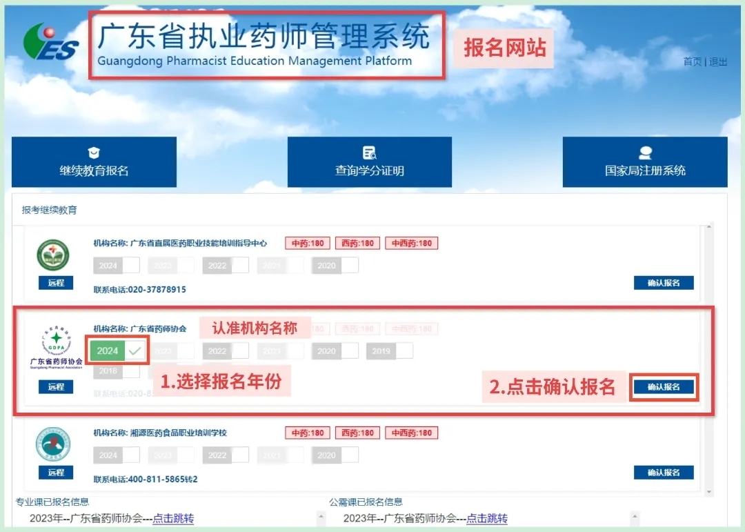 目前,广东执业药师管理系统中继续教育报名页面,已由“按课程表选择施教机构”调整为“直接显示施教机构选课”。执业药师现可在管理系统报名页面根据施教机构名称直接选择施教机构和报名年份。