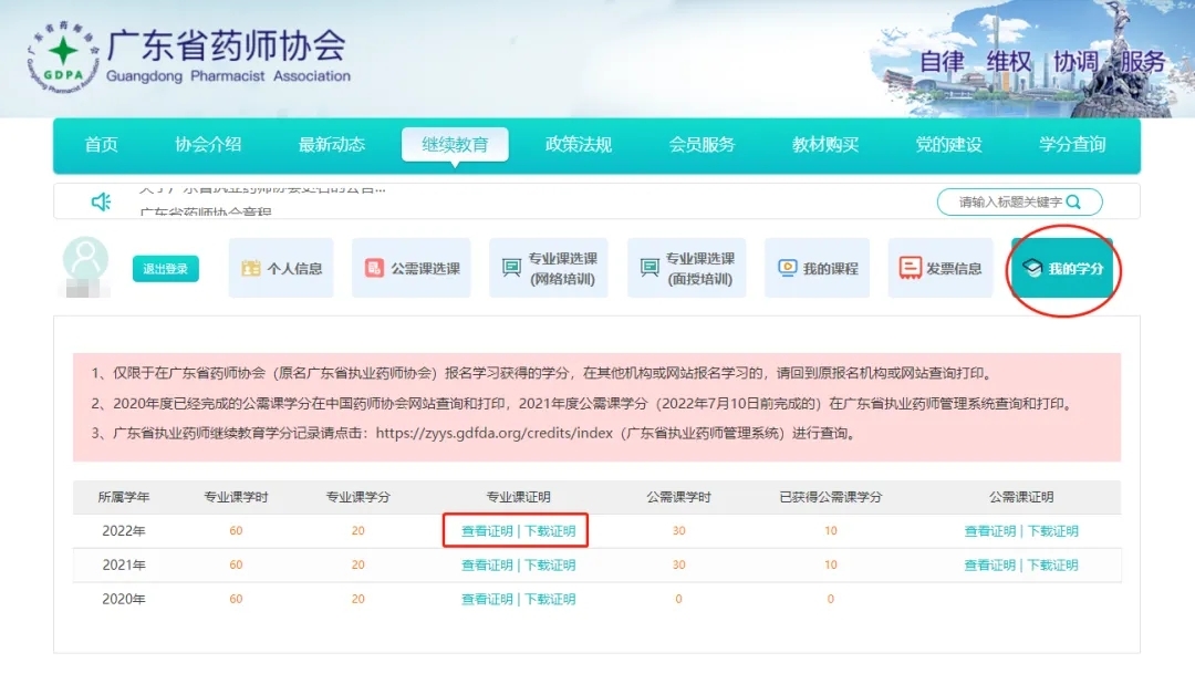 点击【我的学分】查看或下载证明(在其他机构网站学习获取的学分,请回到原报名机构网站查询打印)。