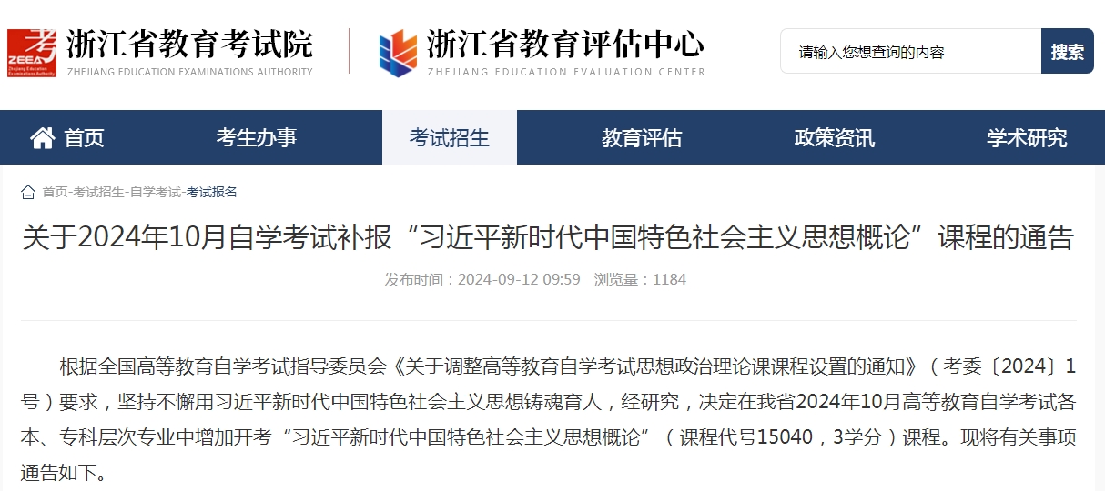 浙江教育考试院近日发布了《关于2024年10月自学考试补报“习近平新时代中国特色社会主义思想概论”课程的通告》。公告指出,浙江省将在2024年10月自学考试中新增“习近平新时代中国特色社会主义思想概论”课程。考生需在2024年9月19日9:00至9月20日17:00期间进行补报名。