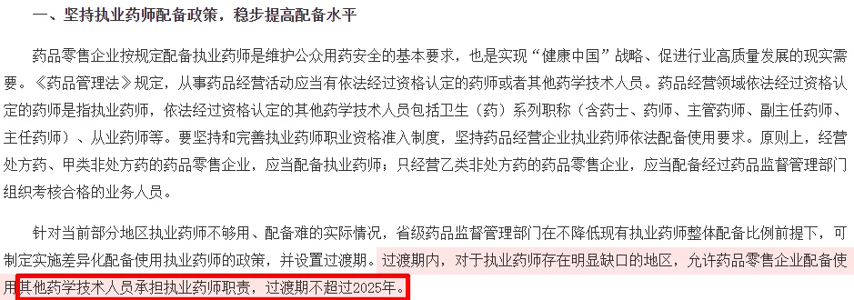 过渡期内,对于执业药师存在明显缺口的地区,允许药品零售企业配备使用其他药学技术人员承担执业药师职责,过渡期不超过2025年。