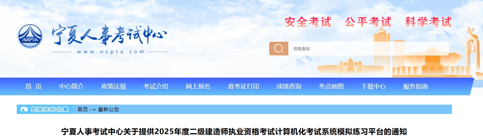 为方便我区报考2025年度二级建造师执业资格考试的考生提前熟悉机考系统操作流程及操作方法,宁夏人事考试中心向参加2025年二级建造师执业资格考试的考生提供机考系统模拟练习平台,现将有关事项通知如下: