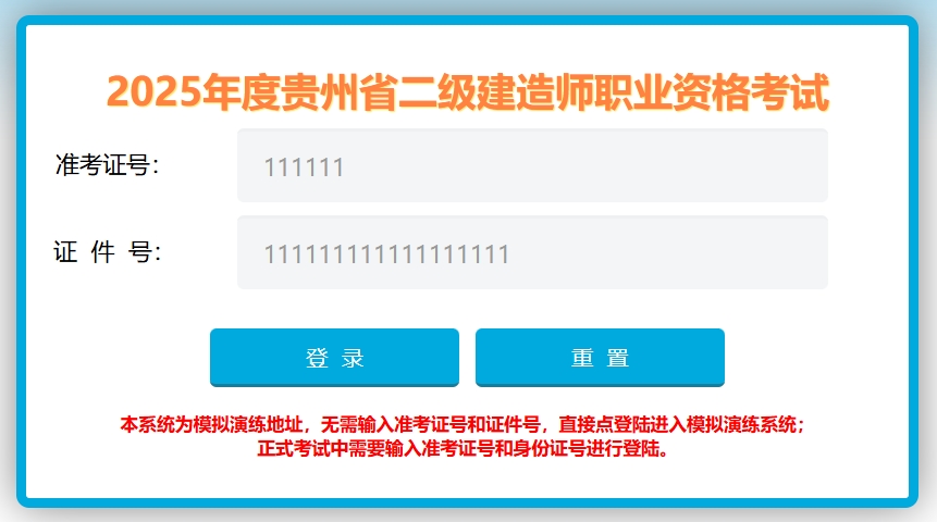 输入机考模拟系统网址后,页面默认准考证号和证件号,无需修改,直接点击登录即可进入2025年贵州二级建造师机考模拟系统。
