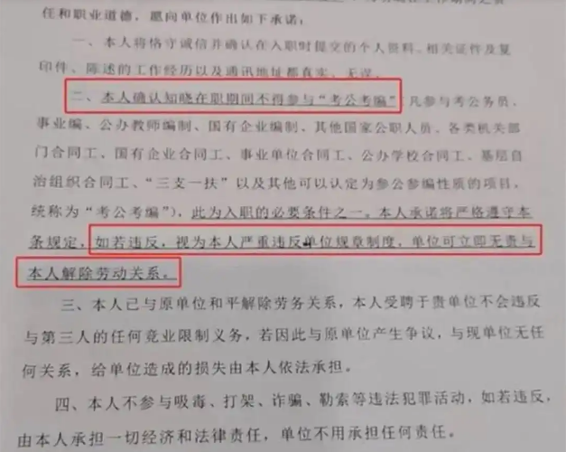 据多家媒体报道,安徽新锐教育集团旗下滁州多所学校新入职教师被要求签订“不参加公务员及编制类考试承诺书”,并采取“考试日查岗”等监控手段: