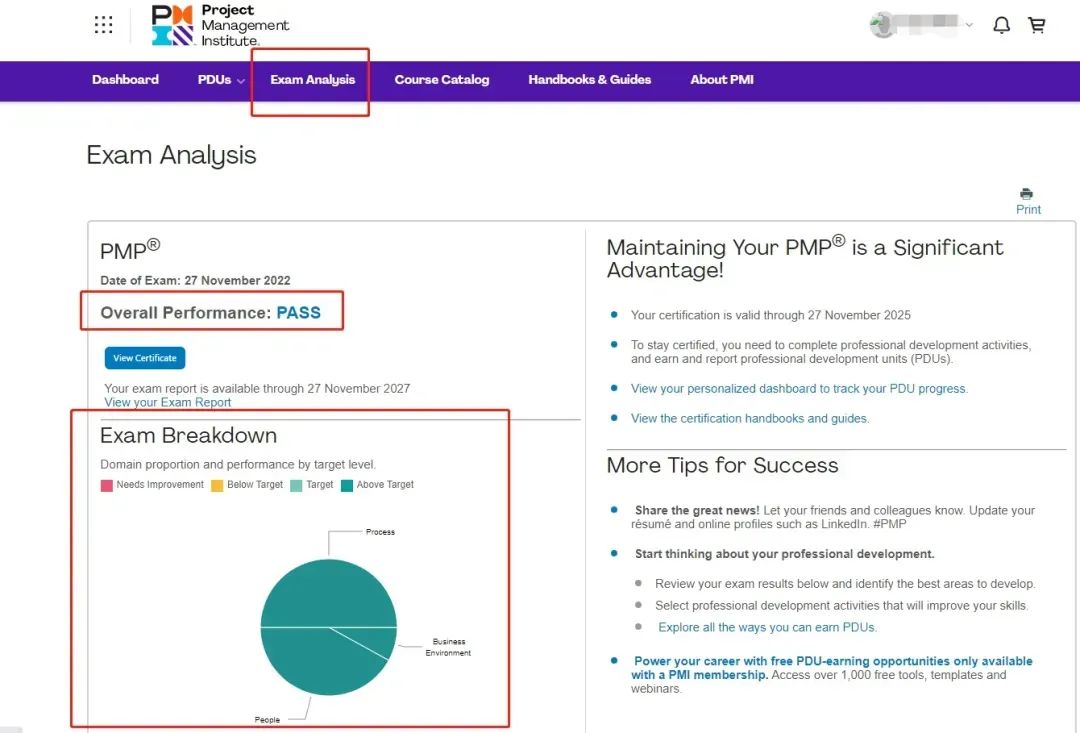 通过考试:登录PMI个人账户,点击【Exam Analysis-View Certificate】选项,即可查询并下载电子证书PDF版本。电子版证书与纸质版证书具有同等效力,日常工作中使用电子版证书即可。若想获取纸质版证书,需等待官方通知。