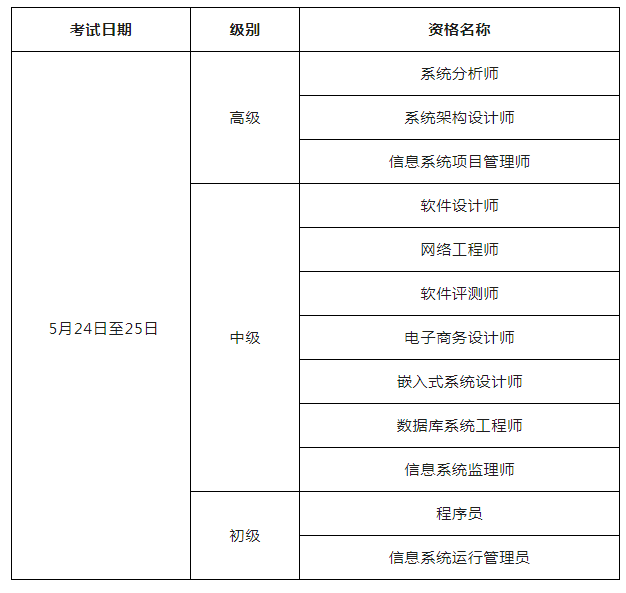 考试时间为5月24日至25日,各级别、各资格的批次划分待考试报名结束后确定,具体考试时间、批次以准考证为准。