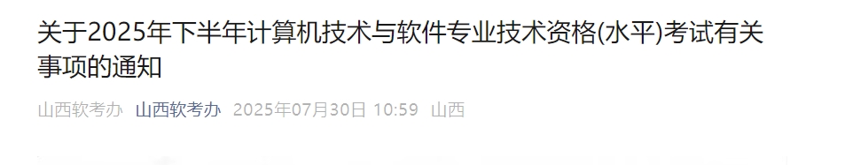 根据人力资源社会保障部办公厅《关于2025年度专业技术人员职业资格考试工作计划及有关事项的通知》(人社厅发[2025]1号)精神,全国计算机专业技术资格考试办公室《关于2025年度计算机技术与软件专业技术资格(水平)考试工作安排及有关事项的通知》(计考办[2025]1号)要求,现就2025年下半年全国计算机技术与软件专业技术资格(水平)考试山西考区的有关事项通知如下: