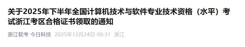 关于2025年下半年全国计算机技术与软件专业技术资格(水平)考试浙江考区合格证书领取的通知