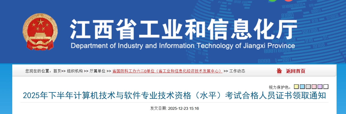2025年下半年全国计算机技术与软件专业资格(水平)考试江西考区合格证书于2025年12月24日起开始发放,现将有关事项通知如下: