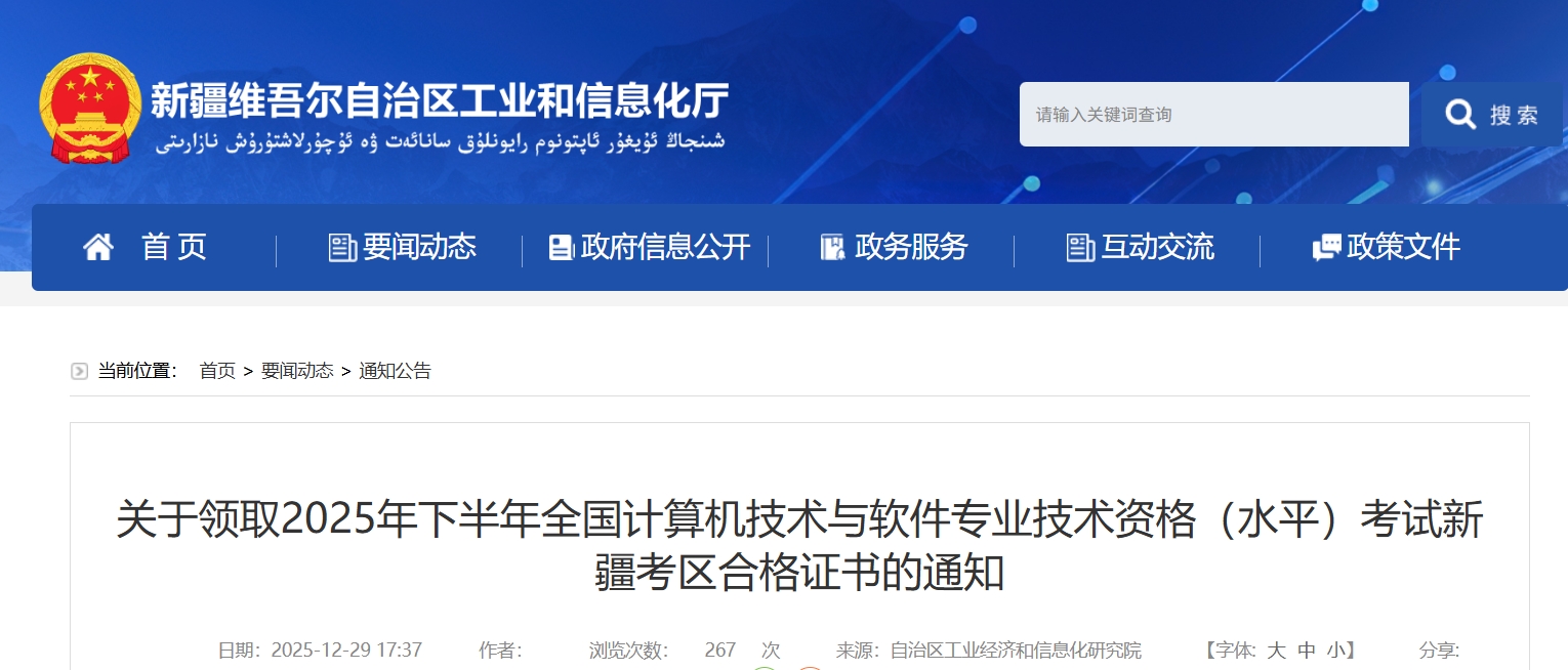 关于领取2025年下半年全国计算机技术与软件专业技术资格(水平)考试新疆考区合格证书的通知