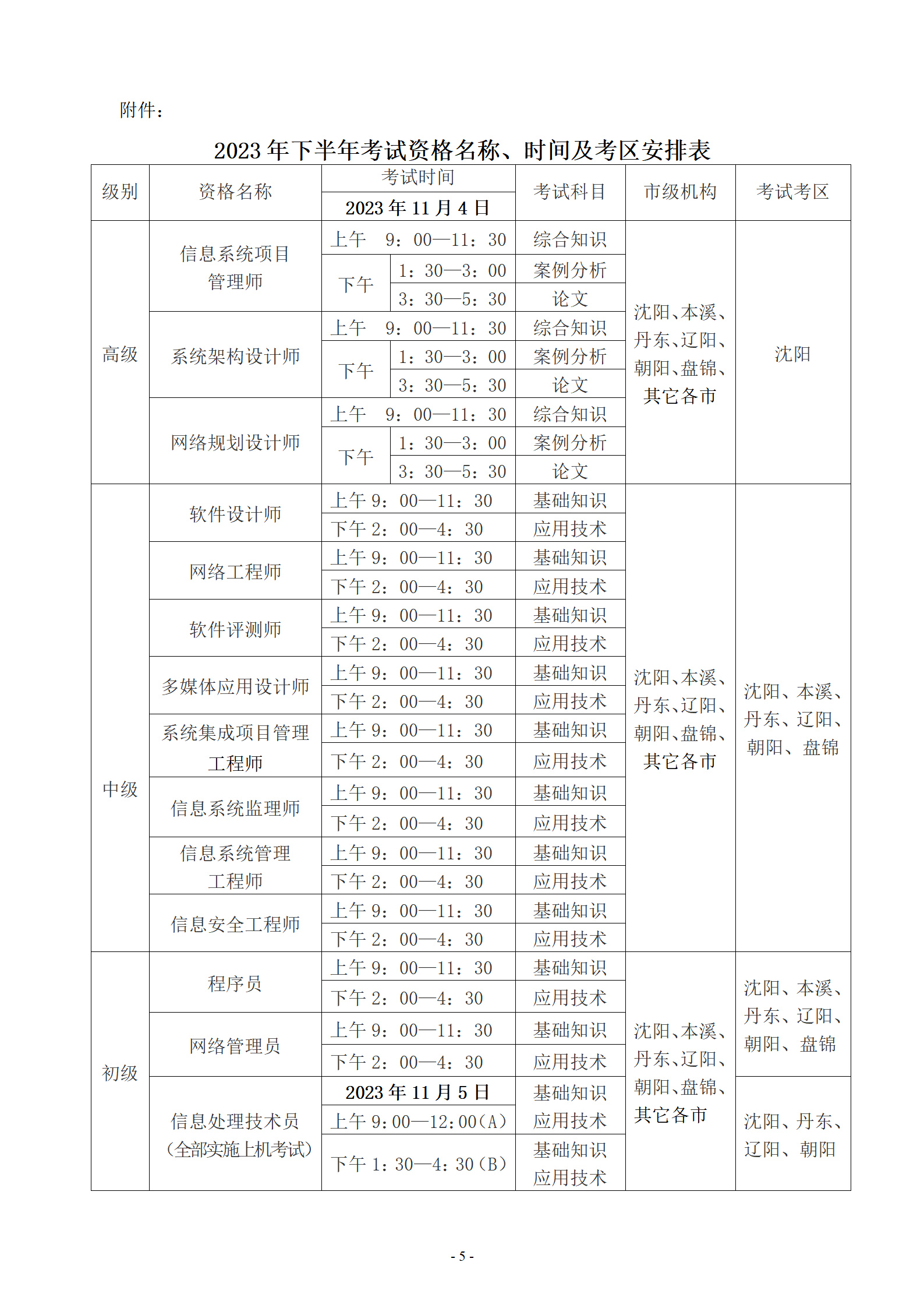 详细信息请参照附件《2023年下半年考试资格名称、时间及考区安排表》。
