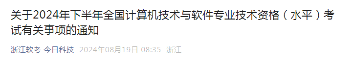 根据人力资源和社会保障部办公厅《关于2024年度专业技术人员职业资格考试计划及有关事项的通知》(人社厅发(2024)1号)和全国计算机专业技术资格考试办公室《关于2024年度计算机技术与软件专业技术资格(水平)考试工作安排及有关事项的通知》(计考办(2024)1号)要求,现就2024年下半年全国计算机技术与软件专业技术资格(水平)考试(以下简称“全国计算机软件资格考试”)浙江考区有关事项通知如下: