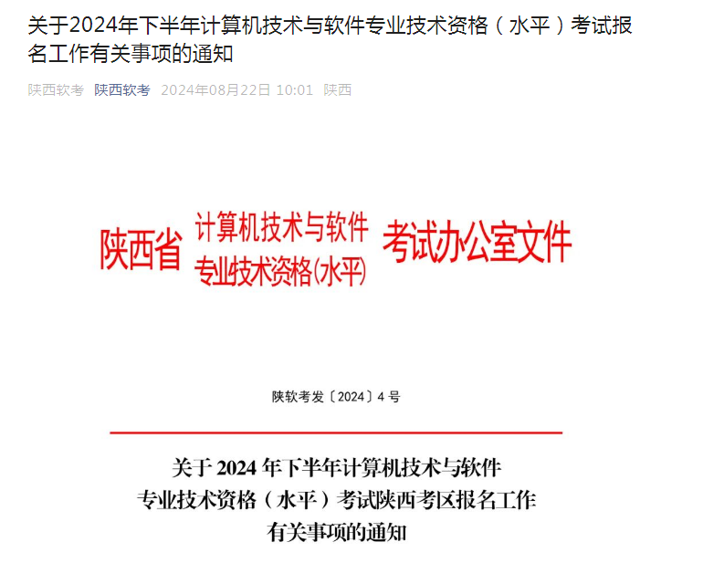 各市(区)人力资源和社会保障局,省级各有关部门人事处,中央驻陕有关单位人事处,各位考生:根据人力资源社会保障部办公厅《关于2024年度专业技术人员职业资格考试工作计划及有关事项的通知》(人社厅发(2024年)1号)、全国计算机专业技术资格考试办公室《关于2024年度计算机技术与软件专业技术资格(水平)考试工作安排及有关事项的通知》(计考办(2024年)1号),2024年下半年全国计算机技术与软件专业技术资格(水平)考试(以下筒称计算机专业技术资格考试)定于2024年11月9~12日举行。为确保计算机专业技术资格考试陕西考区报名和考试组织工作的顺利进行,现将有关工作安排事项通知如下: