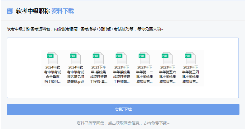 为了便于考生快速获取这份宝贵的备考资源,我们特设专属网盘链接,大家点击文末的软考中级职称“资料下载”和“真题下载”,即可轻松下载全部资料。同时,我们也提供了详细的使用指南,帮助考生快速上手,充分利用网盘资源。