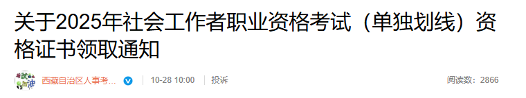 西藏自治区人事考试中心10月28日发布了《关于2025年社会工作者职业资格考试(单独划线)资格证书领取通知》,其中明确了2025年西藏社会工作者证书(单独划线地区)领取时间为10月28日—11月7日,可以通过现场领取、委托领取、邮寄领取方式来领取。