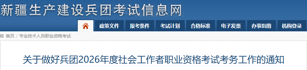 根据人力资源和社会保障部人事考试中心《关于2026年度社会工作者职业资格考试考务工作的通知》(人考中心函〔2026〕2号),2026年度社会工作者职业资格考试于5月23日、24日举行。为做好兵团考区的考务工作,现将有关事项通知如下。
