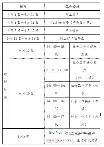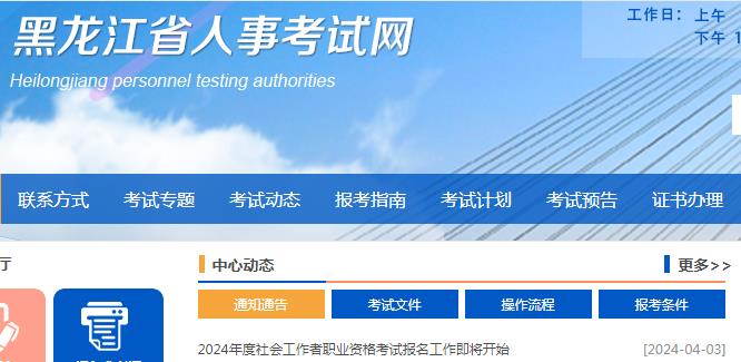 黑龙江省人事考试网4月3日发布了《2024年度社会工作者职业资格考试报名工作即将开始》,其中明确了2024年黑龙江社会工作者考试安排,包括报名时间、考试时间等,请考生知悉。