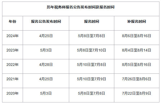 以下是近5年税务师报名公告发布时间及报名时间,以供考生参考。