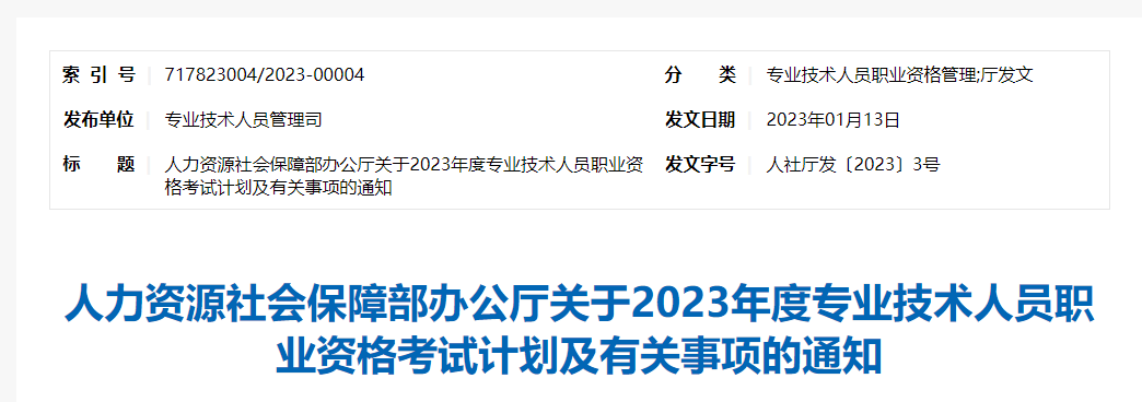 为统筹做好专业技术人员职业资格考试规划和管理工作,便于广大专业技术人员参加职业资格考试,经商有关部门和单位同意,现就2023年度专业技术人员职业资格考试计划及有关事项通知如下: