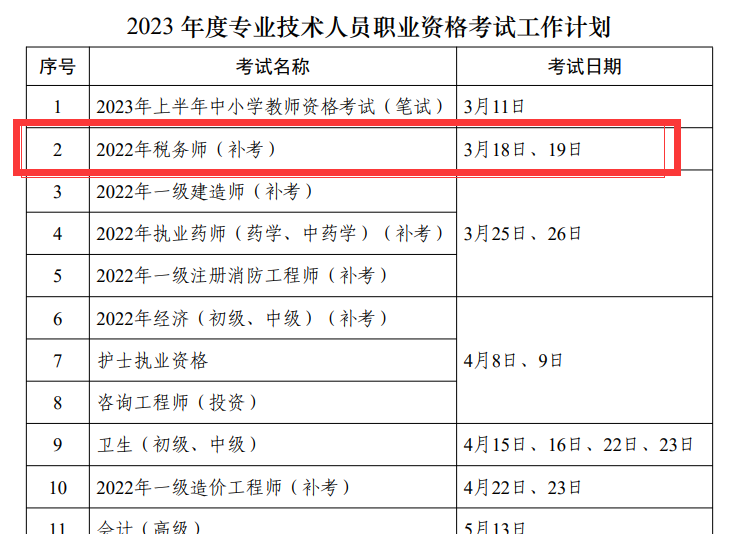 人社部发布2022年税务师补考时间为2023年3月18日-19日