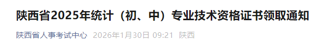 摘要: 陕西省人事考试中心1月30日发布了《陕西省2025年统计(初、中)专业技术资格证书领取通知》,其中明确了陕西省2025年统计师证书邮寄领取时间为2026年1月30日起;现场领取时间为2026年2月3日—2026年2月12日和2026年2月24日—2026年3月5日。