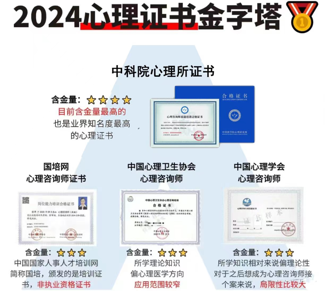 自2017年起,人社部取消了心理咨询师资格证的考试,意味着传统的国家心理咨询师资格证书不再颁发。市场上存在多种心理咨询师证书,但它们的含金量和社会认可度各不相同。例如,中国人事人才培训网颁发的专业技术人员培训证书,虽然具有一定的行政政策优势,但已于2024年2月被国家下令整改。而中国心理学会颁发的心理咨询师岗位技能证书,虽然属于行业内自律组织,但其含金量并不高。目前,想要报考心理咨询师证书的人只能选择第三方培训机构颁发的证书。在这些第三方证书中,中科院心理所颁发的心理咨询基础培训合格证书因其权威性和实用性而备受推崇。该证书的课程设计参考了《心理咨询师国家职业标准》,内容丰富、有针对性和实用性。