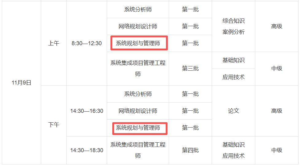 2025下半年系统规划与管理师考试时间及批次安排已出。根据工业和信息化部教育与考试中心关于2025年下半年软考考试批次安排的通告,2025下半年系统规划与管理师考试时间具体为11月9日上午8:30-12:30及下午14:30-16:30,仅一个批次。