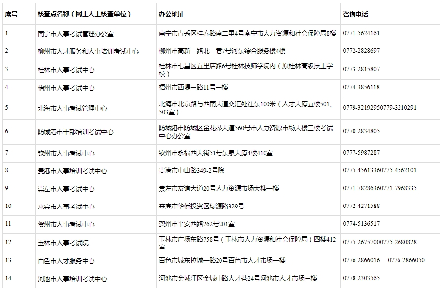 全区人事考试组织机构(核查点)地址及联系方式如下: