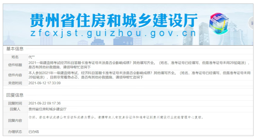 此前,有贵州考生在2021年一建考试后遇到了同样的窘境:经济科目的准考证号只填写了数字,却忘记涂黑对应的方框。对此,贵州省住建厅给出了明确答复: