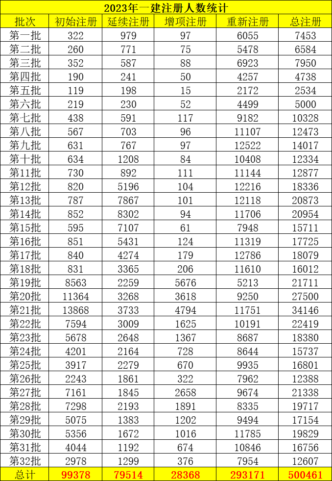 截止目前,住建部已公布第1-32批一级建造师注册人员名单公告,共500461人符合一级建造师注册条件,其中,初始注册共99378人,延续注册79514人,增项注册28368人,重新注册293171人,具体公告如下: