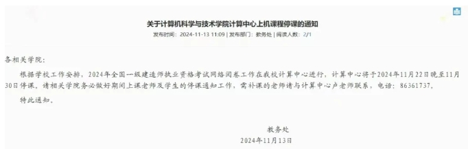 自今年一级建造师考试结束以来,关于阅卷的消息不断。根据官网在报名通知中发布的信息,一级建造师成绩预计在12月上旬公布。近日,网上流传山东建筑大学发布的《关于计算机科学与技术学院上机课程停课的通知》,其中提到2024年全国一级建造师执业资格考试网络阅卷工作在该校计算中心进行,计算中心将于2024年11月22日晚至11月30日停课。