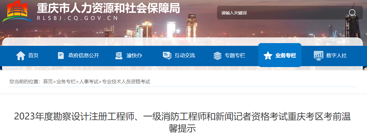2023年度勘察设计注册工程师、一级消防工程师和新闻记者3项资格考试将于11月4日、5日举行,为更好服务考生、维护考试公平公正,重庆市人事考试中心温馨提示如下: