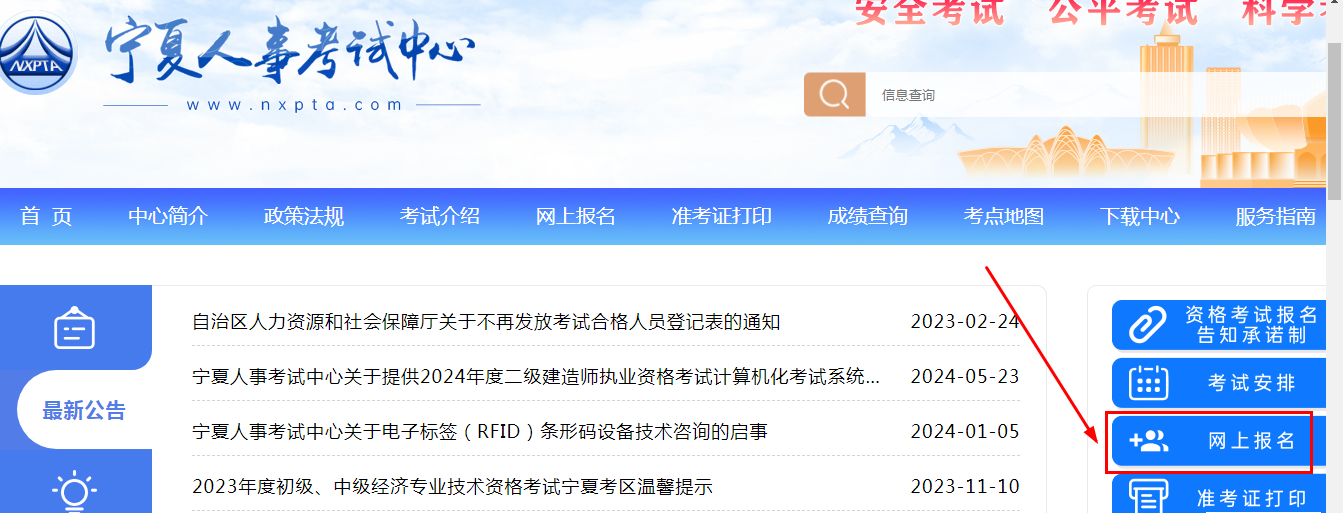 报考人员可登录“宁夏人事考试中心网”(http://www.nxpta.com)“网上报名”栏目,进入专业技术人员资格考试报名系统进行网上报名,系统不间断接受报考人员预报名。报名系统只接受工作地或居住地在宁夏的报考人员报名。
