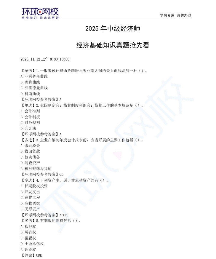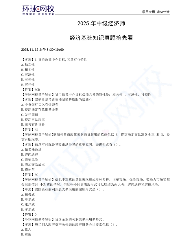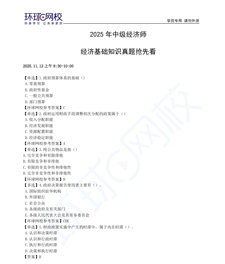 2025年中级经济师11月2日《经济基础》上午场真题及答案已出3轮,根据考生回忆,环球网校教研老师特将三轮真题及解析进行整理,以下分享给大家,大家可据此预估分数!