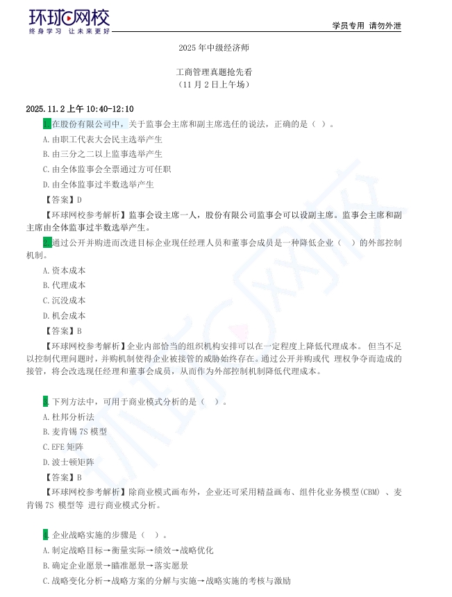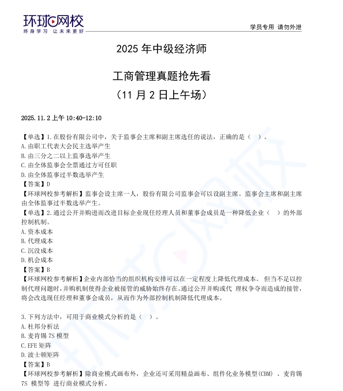 2025年11月2日上午场中级经济师《工商》科目第三轮考试已结束,环球网校第一时间整理了考生回忆版真题及参考答案,希望能够帮助大家预估分值!