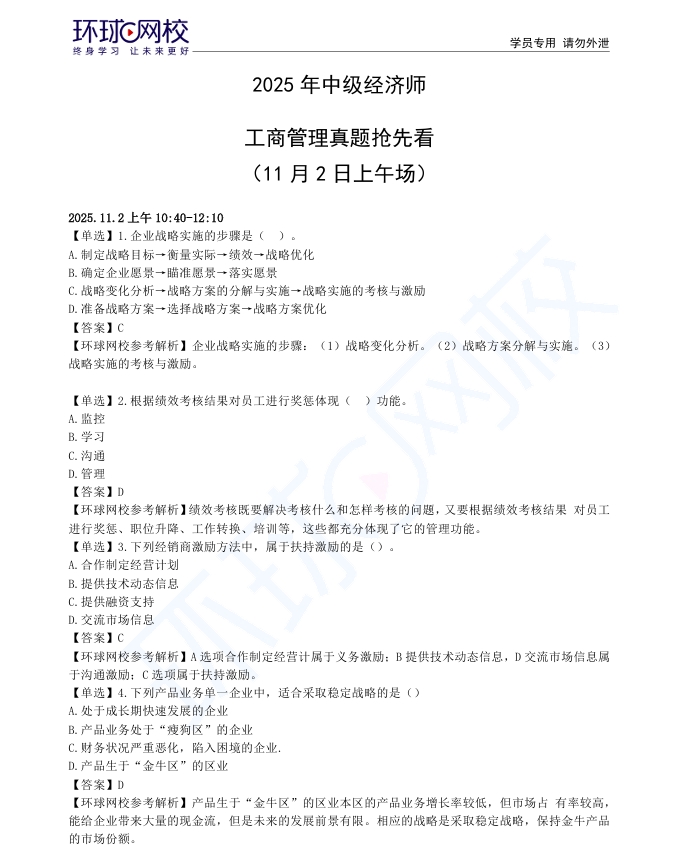 因展示篇幅有限,完整版真题及答案解析请点击>>>2025年中级经济师《工商》真题答案汇总进行查看!