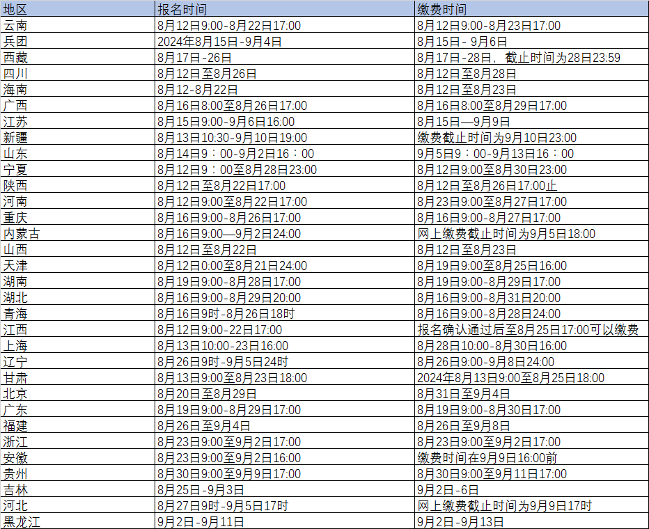 2024年全国各省市所有地区的中级经济师报名时间主要集中在8月12-9月11日,以下是具体的报名时间: