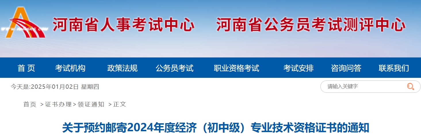 河南省人事考试中心发布的关于中级经济师证书邮寄通知如下: