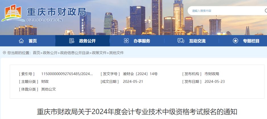 重庆财政局:2024年重庆中级会计报名时间为6月12日至7月2日