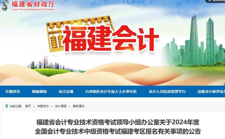 近日,福建省财政厅发布《福建省会计专业技术资格考试领导小组办公室关于2024年度全国会计专业技术中级资格考试福建考区报名有关事项的公告》,公告明确了2024年福建省中级会计的相关事项。